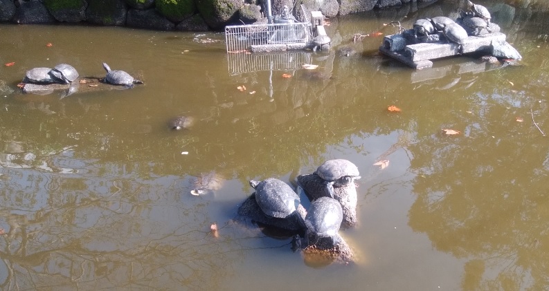 そんな中で昼食のために1階まで下りセンター周辺を散策していたところ、センターと駐車場の間の隅に小さな池を発見した。近づいてみると、少し濁った水の中に魚らしきものは見えない。しばらく眺めていると、何か動く気配が。池の中央に置かれた人工の島らしきところに置物かと思っていたのが動く。カメだと初めて気づく。カメが首や足を出したり入れたりして動いている。それも一匹ではない。中央部の島に三、四匹、右上、左上の島にも数匹いる。
